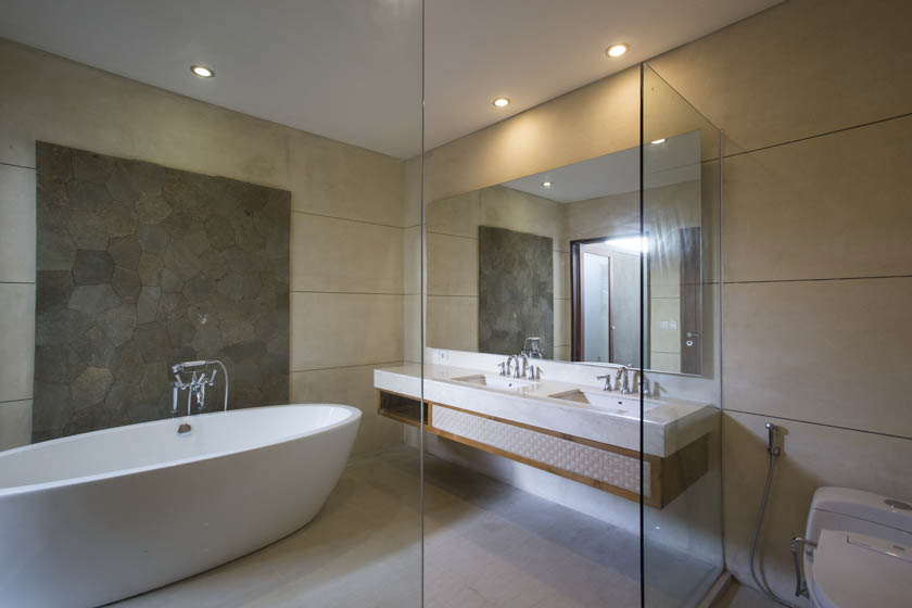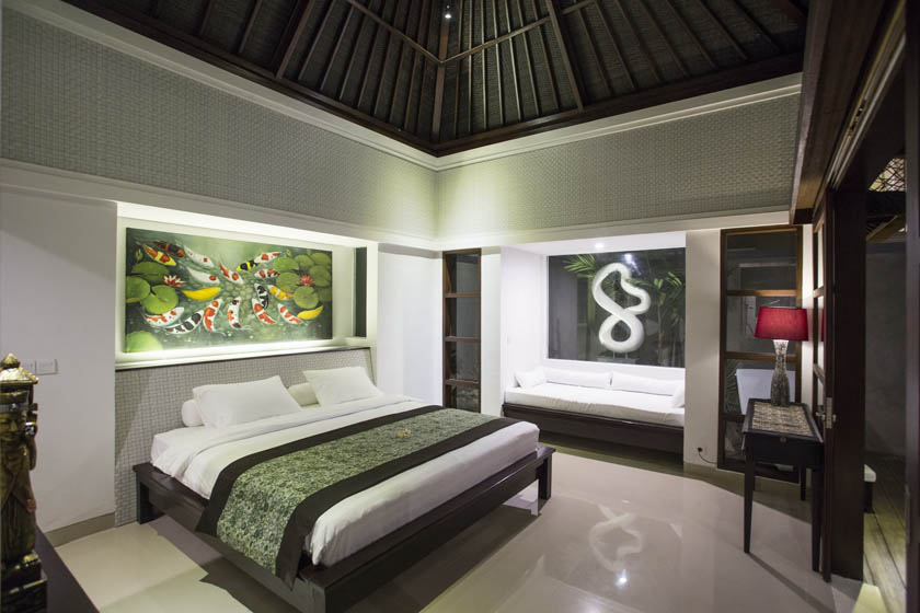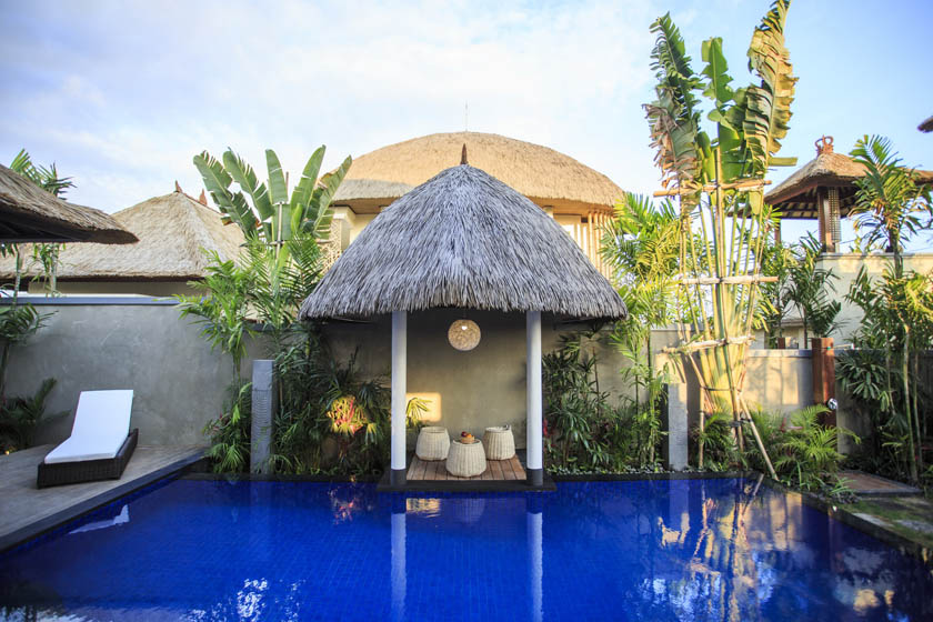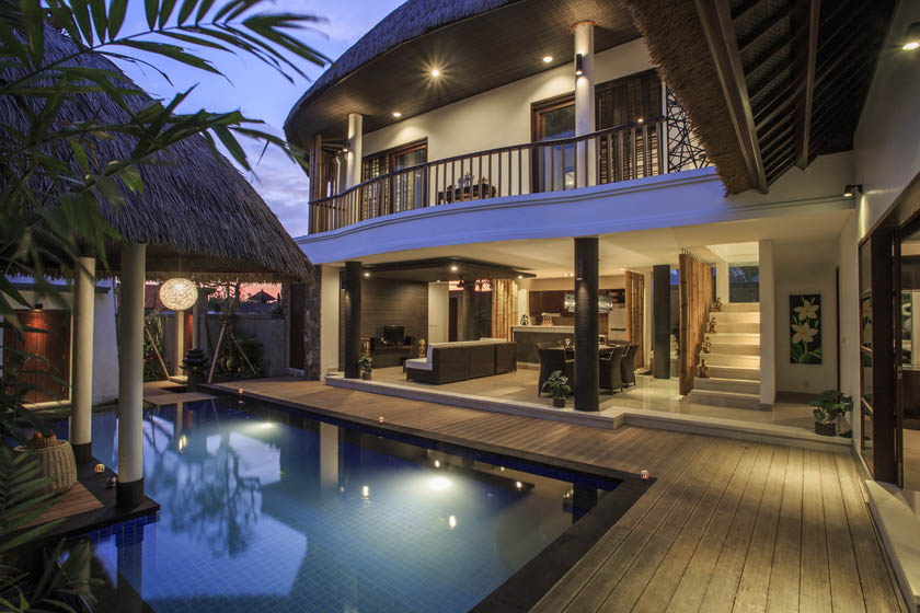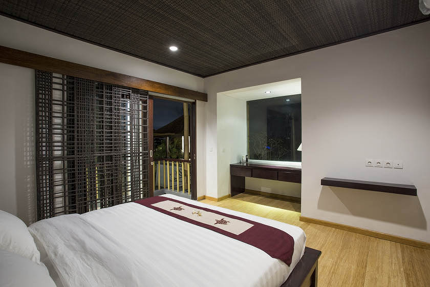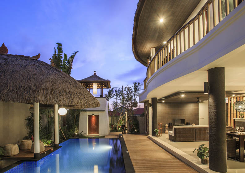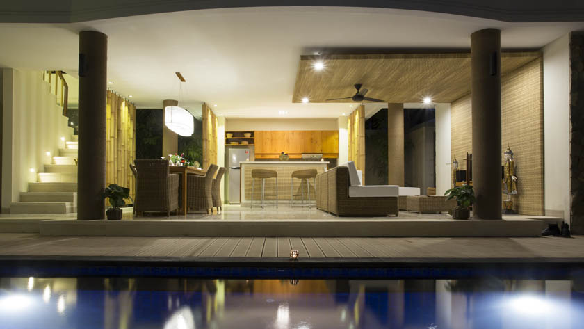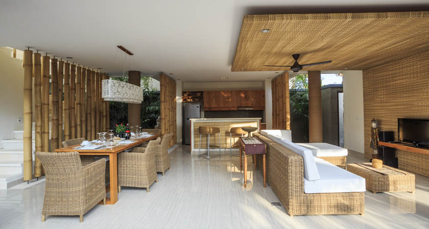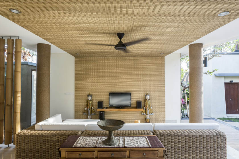 Virothatch roofing system installed with the traditional Balinese style (Berawa). Virosurface, basket weave installed in interior wall panels, Virocane and Viro Rope used as decorative elements within villas. Custom Viro Archineering products for room separators.